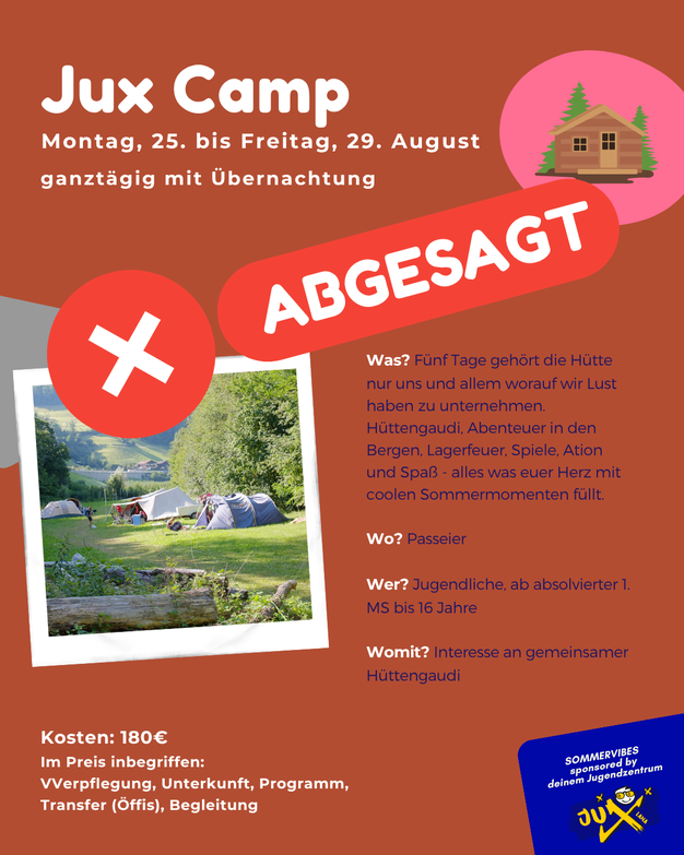 "Das wird ein cooler Sommer! Sei bei den Jux Sommerwochen Jux aktiv dabei, denn hier erlebst du mit uns Spaß, Spiel, Aktion und Teamgeist. Und weil der Sommer für dich ja Erholung sein soll, kommt mit der Sonne auf der Haut und den Füßen im kühlen Nass die ordentliche Portion Chillen auch auf keinen Fall zu kurz.