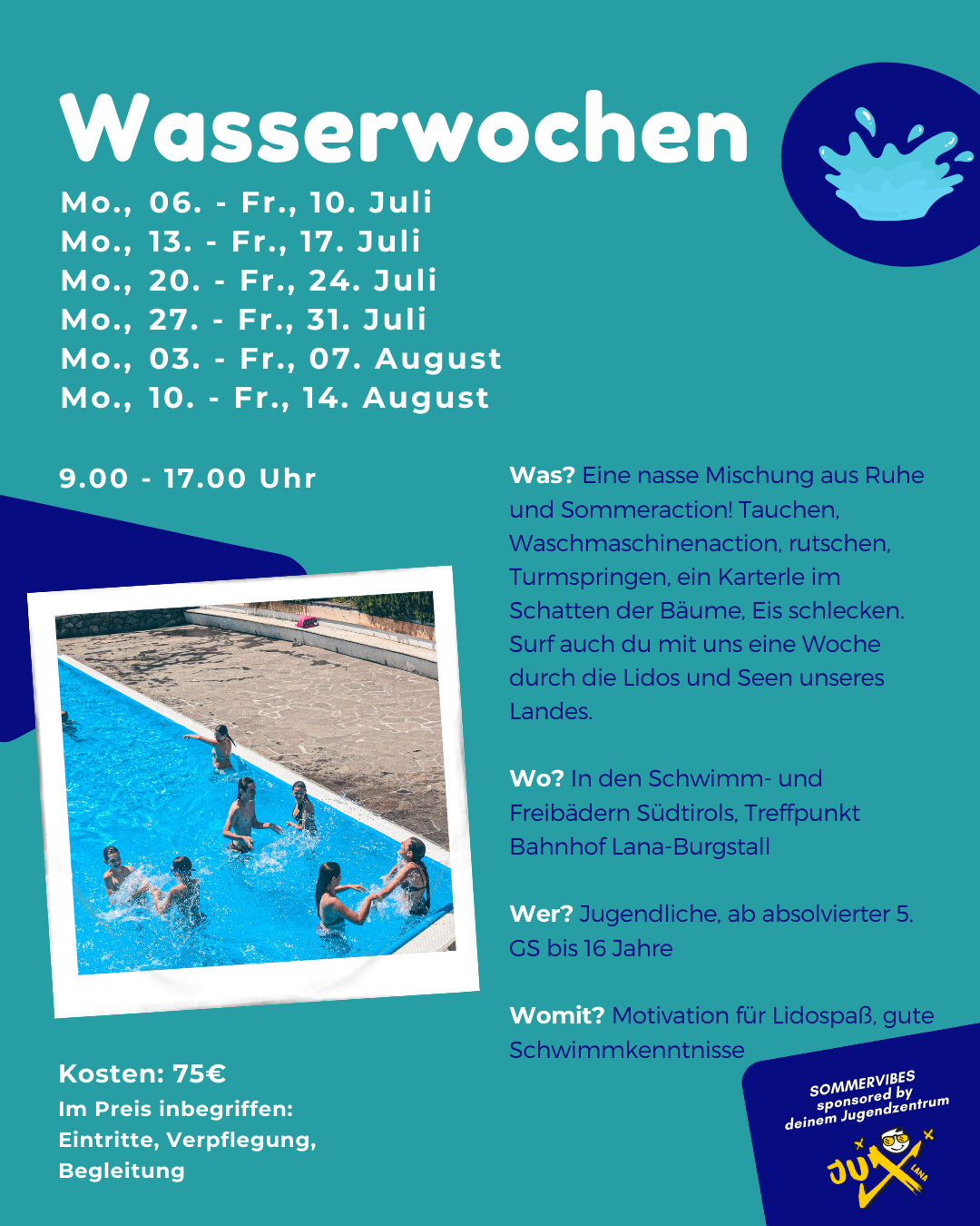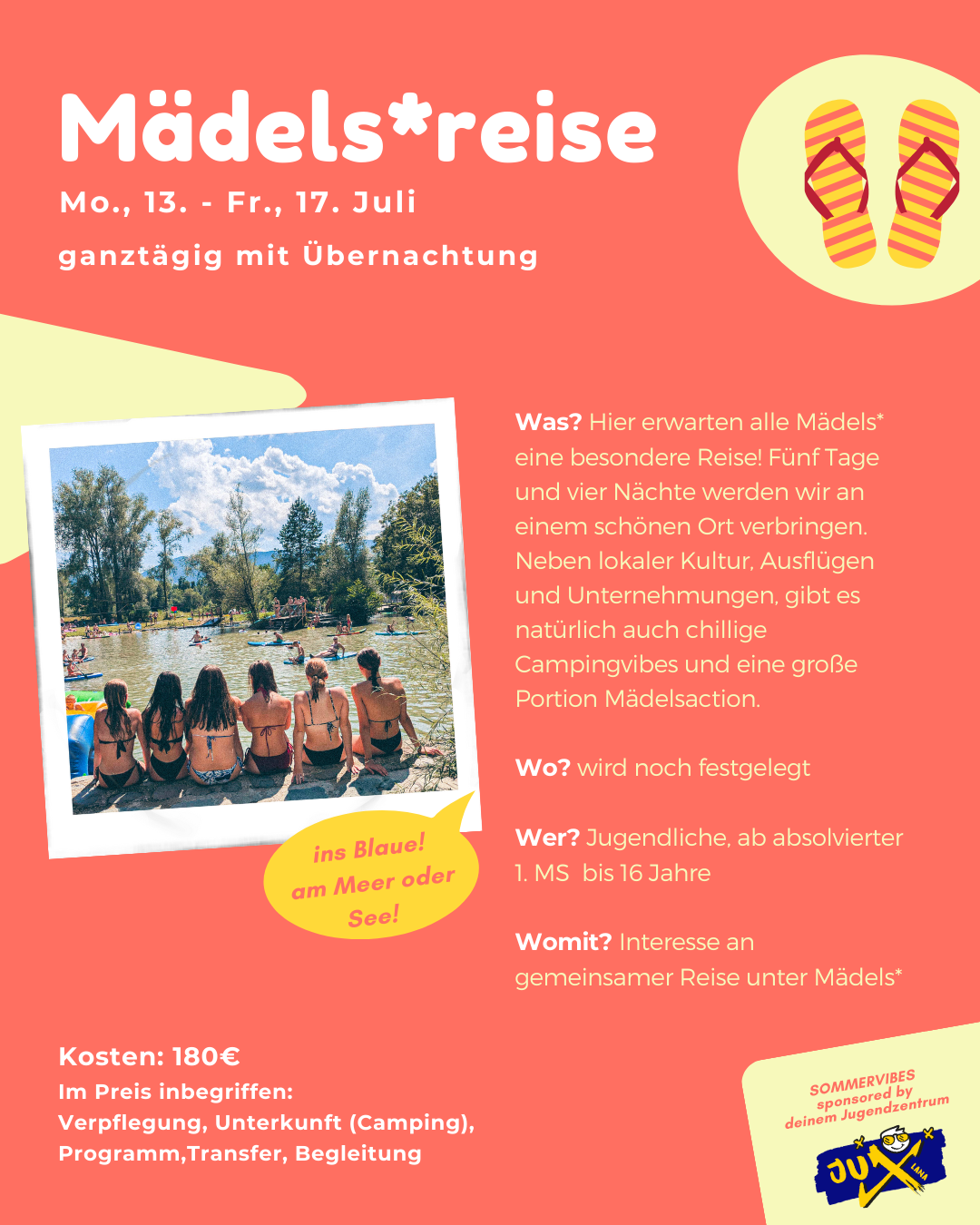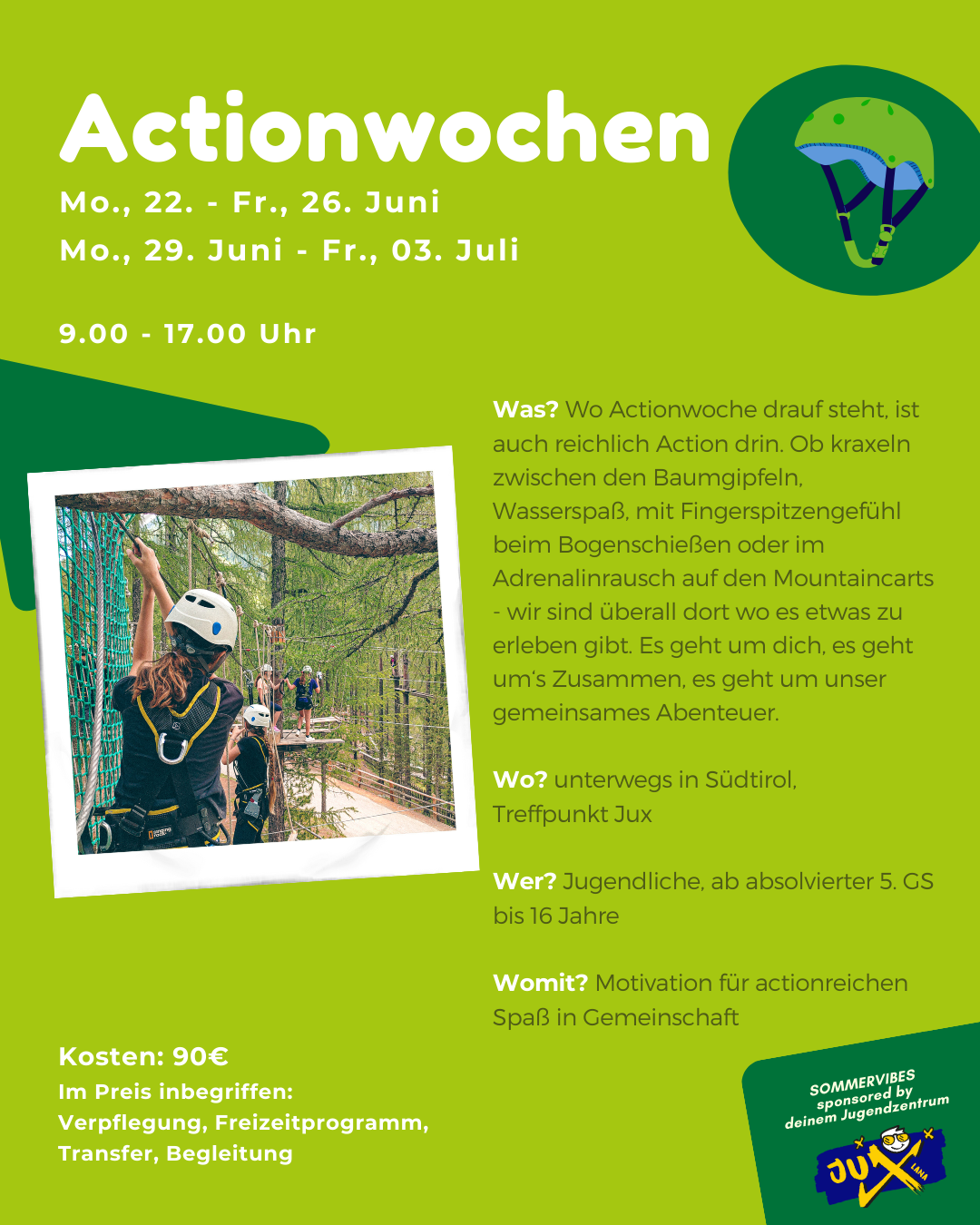 Bei den Jux Sommerwochen warten jede Menge Action, Kreativität und echter Zusammenhalt auf dich. Gleichzeitig kannst du bei uns entspannen, die Sonne genießen und dich im kühlen Wasser abkühlen. Ob Neues entdecken, aufregende Erlebnisse sammeln oder einfach gemütliche Sommertage genießen – im Jux ist für jeden etwas dabei.